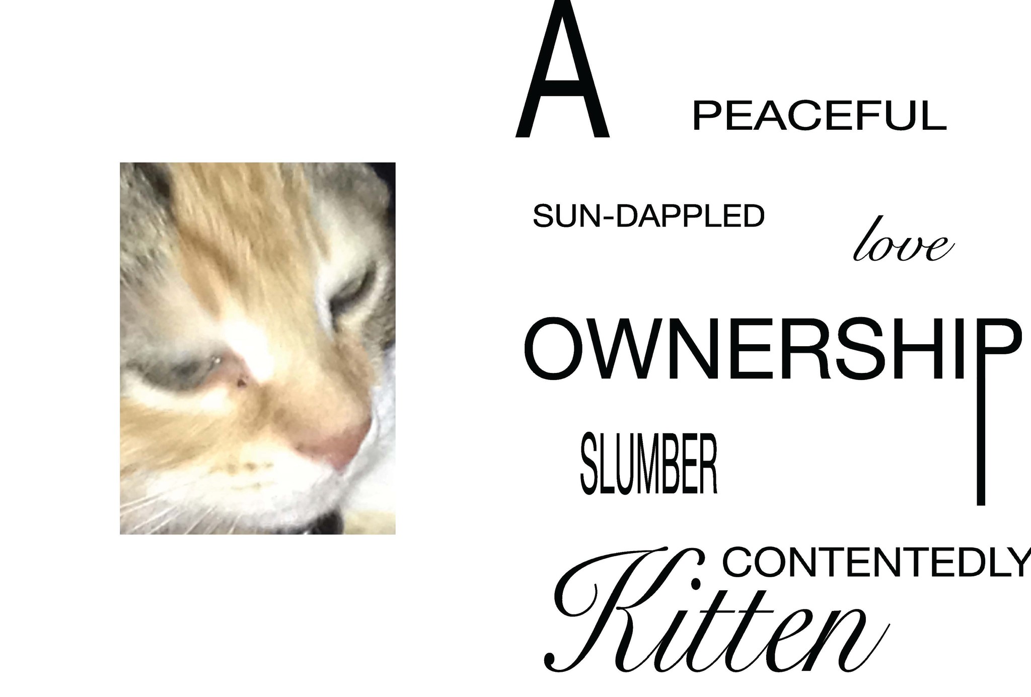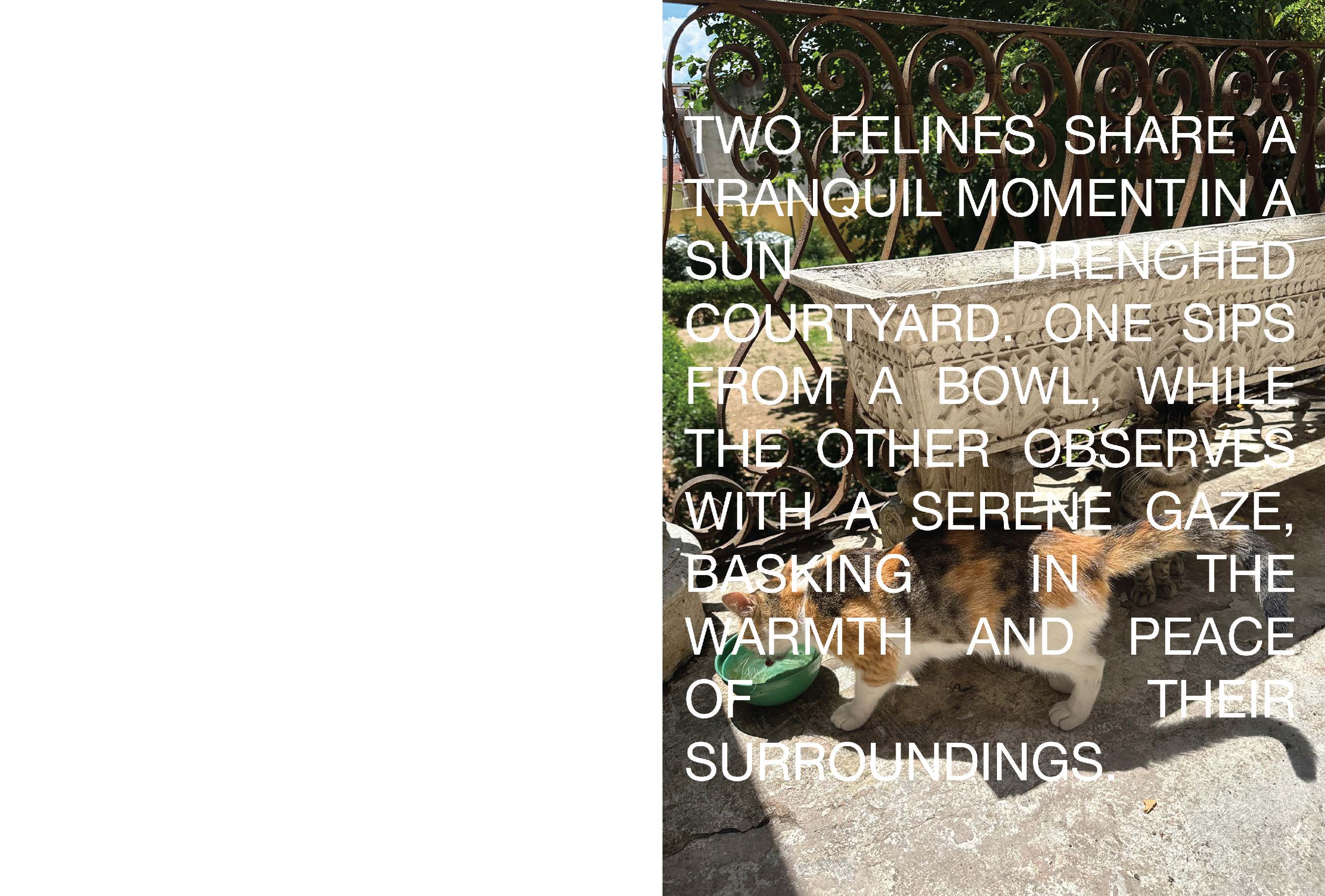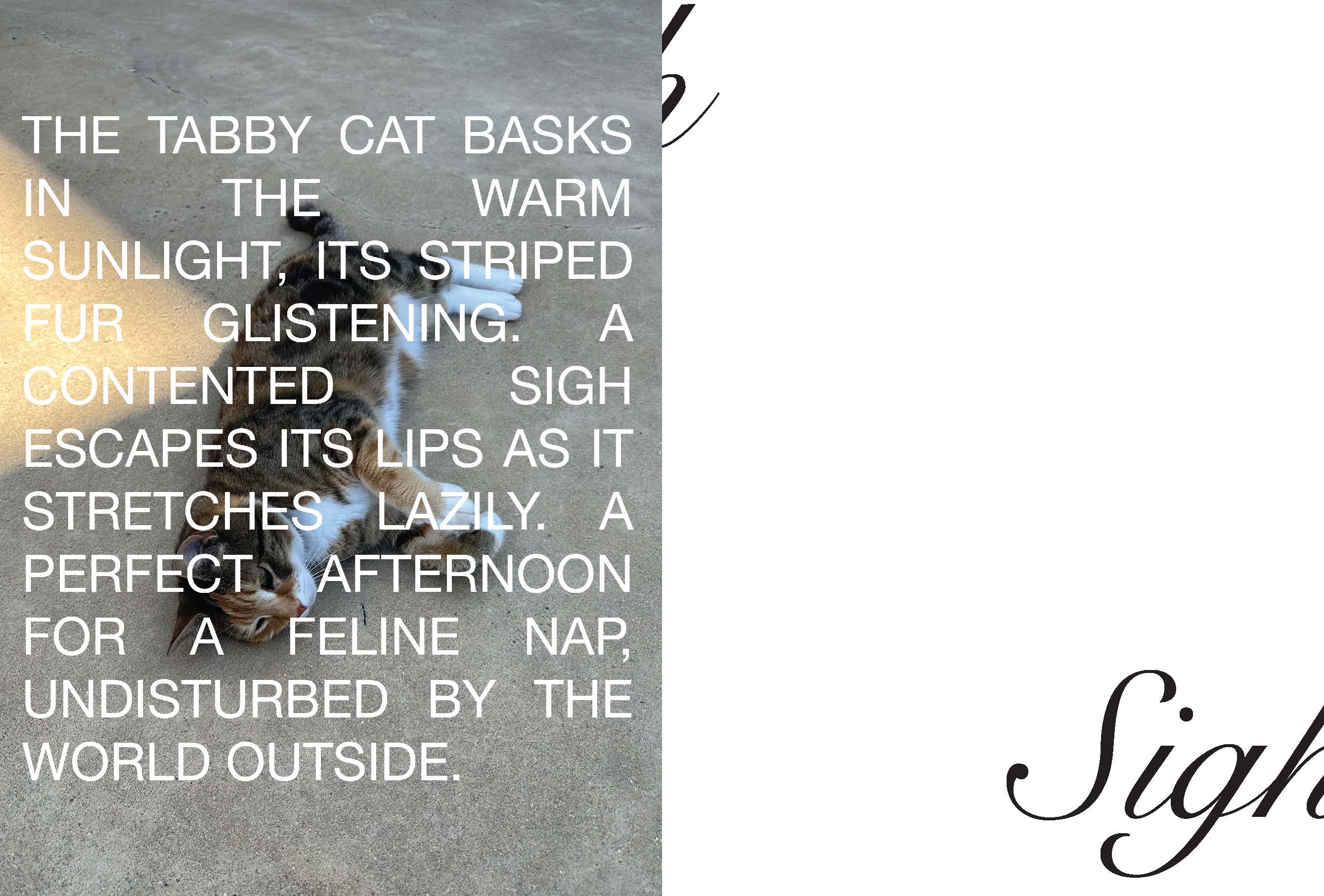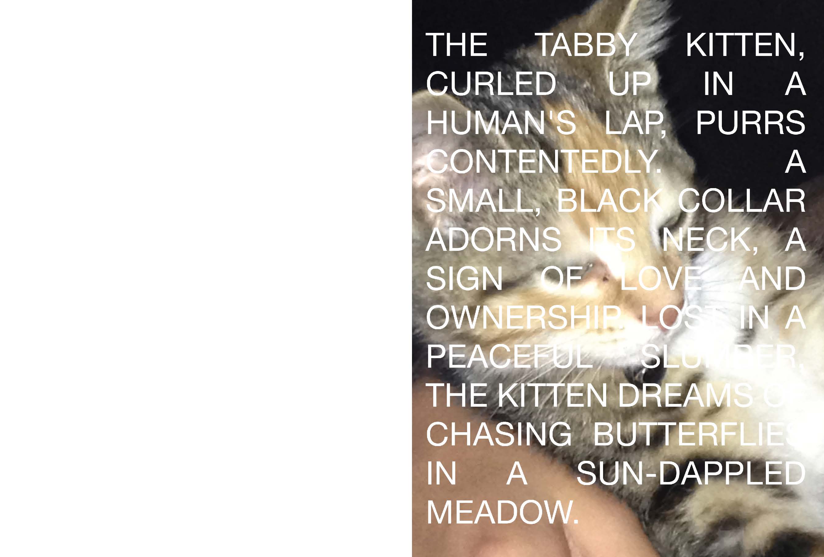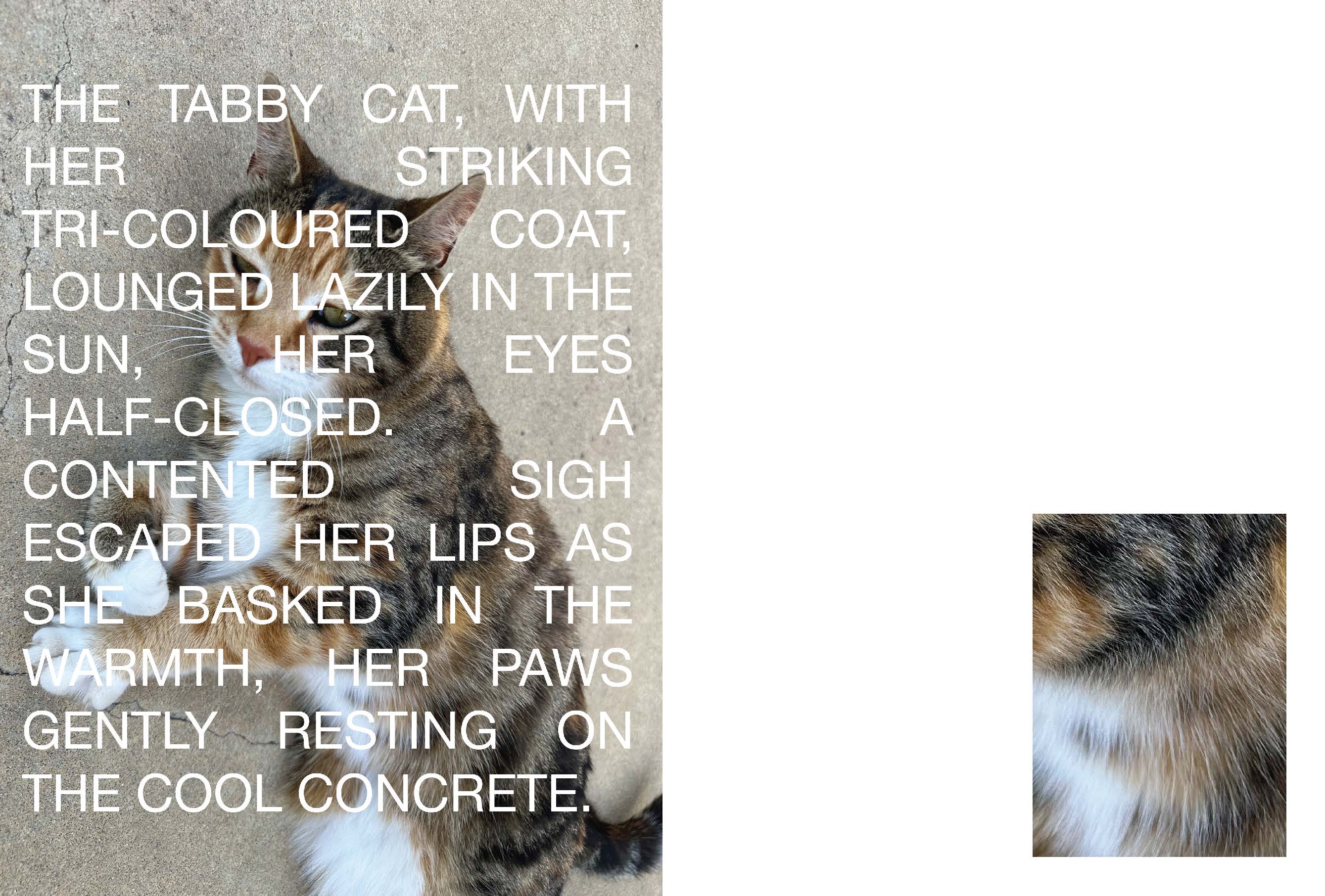My design approach involved a collaboration with AI-chatbots such as Google’s Gemini to generate short phrases and stories describing images of my cat. I found the artificiality of the writing style and authenticity of the images to create a beautifully contrasted piece of work, representative of the dichotomies posed by scrapism as practicing designers and artists within the modern world.